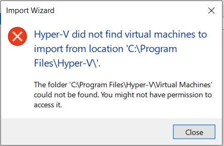 - After downloading Hyper-V I could able to open Hyper-V Manager, but when I clicked on “import virtual machine” under the “action” menu and selected the path where I downloaded Hyper-V. I received the following error message as in fig.1.