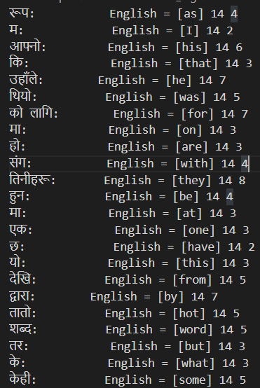 My goal was to display the Nepali words and English translation of those words next to each other in the same line with a colon in between and space equals to maximum number of bytes of longest word or phrase to put in the format as similar to columns in table. In this way, all the translated English word align next to Nepali words at the same place for better look and quick search. We could able to accomplish to put words with better alignment approximate to table format by adding colon just after each Nepali word and put English translation of those words in “English = [English word]” format as shown above in fig.1. However, we still couldn’t put it exactly like in a column aligned in the table. This is because the space taken by each character in English and Nepali is different. We found that a Nepali word having exactly an equal number of characters takes less space than an English word. Not only that, even Nepali words having equal number of character may also take different number of space/byte as shown in row 5 and 7, row 8 and 9. Though these Nepali words are of equal number of bytes, but one takes less space than others. To resolve this issue, we should convert all unicode to fixed width. Right now, NLP++ doesn’t support non-proportional font. Therefore, I could not put parsed words aligned all words in each rows to one place as in columns of the table.