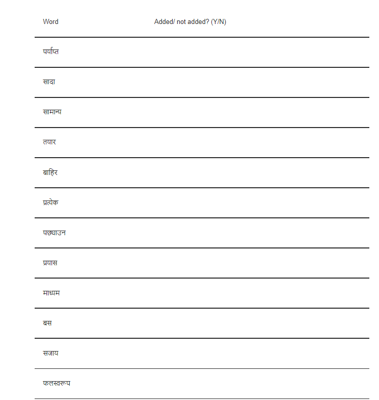 I also started to create a dataset where I am adding all the Nepali words that are currently unlisted in the Wiktionary. Some of the words are as follows: