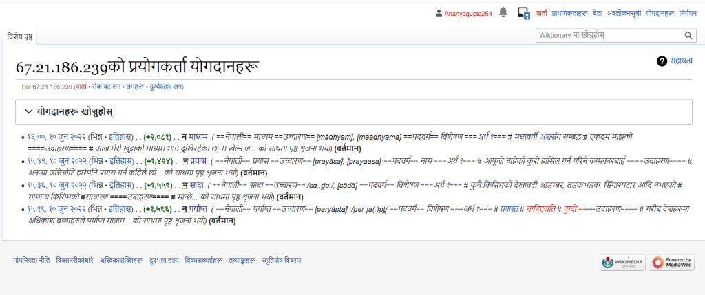 Today, I added all four words to the Nepali Wiktionary successfully and made modifications in the template as needed for proper formatting. I made changes to the template on the website as well. Later, I added the template of word entry both in English and Nepali to the GitHub , “dict-ne” created by David. Additionally, I added two words to the GitHub as examples of word entries in the designed template. The entries to the Wiktionary are in the following fig.: